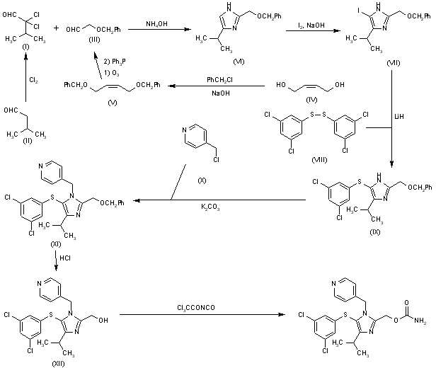 Cyclization of 2,2-dichloroisobutyraldehyde (I) - obtained by reaction of isovaleraldehyde (II) with chlorine in DMF - with 2-benzyloxyacetaldehyde (III) - produced by reaction of 2-butene-1,4-diol (IV) with benzyl chloride by means of NaOH in water, followed by ozonolysis in MeOH and finally reduction with triphenylphosphine in ethyl acetate - and aqueous NH4OH in methanol gives the imidazole derivative (VI), which is iodinated with I2 and NaOH in dichloromethane to yield the 5-iodoimidaz-ole derivative (VII). Condensation of compound (VII) with bis(3,5-dichlorophenyl)disulfide (VIII) by means of LiH in DMSO affords the dichlorophenylsulfanyl imidazole (IX), which is alkylated with 4-(chloromethyl)pyridine (X) and K2CO3 in DMF to provide the fully substituted imidazole (XI). Debenzylation of compound (XI) with conc. HCl in refluxing ethanol gives the carbinol (XII), which is finally treated with trichloroacetyl isocyanate and triethylamine in methanol/water.