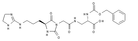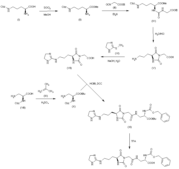 Conversion of amino acid (I) into its methyl ester derivative (II) by means of SOCl2 in MeOH, followed by coupling with ethyl isocyanatoacetate (III) and Et3N in CH2Cl2/THF yields derivative (IV). Cyclization of (IV) by means of H2O/HCl affords hydantoin (V), which reacts with 2-methylthio-2-imidazoline (VI) in an aqueous NaOH solution to provide cyclic guanidine derivative (VII). Treatment of amino acid (VIII) with isobutylene (IX) and H2SO4 in dioxane affords t-Bu ester (X), which then couples with (VII) by means of HOBt and DCC in DMF to furnish derivative (XI). Finally, tert-butyl ester is hydrolyzed by treatment with TFA in the presence of 1,2-dimercaptoethane.
