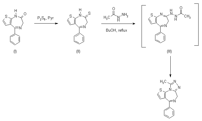 Treatment of diazepinone (I) with phosphorus pentasulfide in refluxing pyridine affords diazepinethione (II). Subsequent reaction with acetyl hydrazine in refluxing n-butanol gives the intermediate acetylhydrazino compound (III), which on prolonged heating cyclizes to the desired triazolodiazepine.