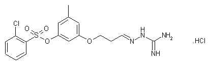 2-Chlorobenzenesulfonyl chloride (I) was coupled to orcinol (II) to give sulfonate (III). Subsequent condensation of (III) with 3-benzyloxypropanol (IV) under Mitsunobu conditions afforded ether (V). After hydrogenolytic deprotection of the benzyl group, Swern oxidation of the resulting alcohol (VI) with DMSO and SO3-pyridine complex provided aldehyde (VII). The title amidinohydrazone was then obtained by treatment of (VII) with aminoguanidine nitrate (VIII).