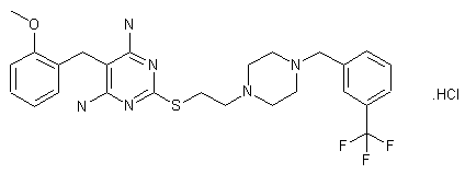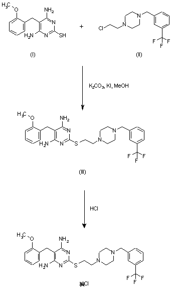 EGIS-9933 was synthesized by S-alkylation of 4,6-diamino-2-mercapto-5-(2-methoxybenzyl)pyrimidine (I) with 1-(2-chloroethyl)-4-[3-(trifluoromethyl)benzyl]piperazine (II) in the presence of potassium carbonate and a catalytic amount of potassium iodide in refluxing methanol. The product was recrystallized from aqueous ethanol, and converted to the hydrochloride.