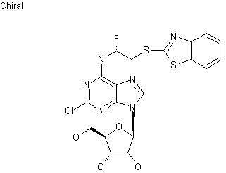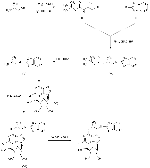 Protection of D-alaninol (I) with di-tert-butyl dicarbonate gave rise to carbamate (II). Subsequent Mitsunobu coupling of (II) with 2-mercaptobenzothiazole (III) furnished thioether (IV), which was deprotected with HCl in EtOAc. The resulting amine (V) was condensed with dichloropurine (VI) to afford the chloroadenosine derivative (VII). Finally, cleavage of the acetate esters of (VII) was achieved by treatment with NaOMe in MeOH.