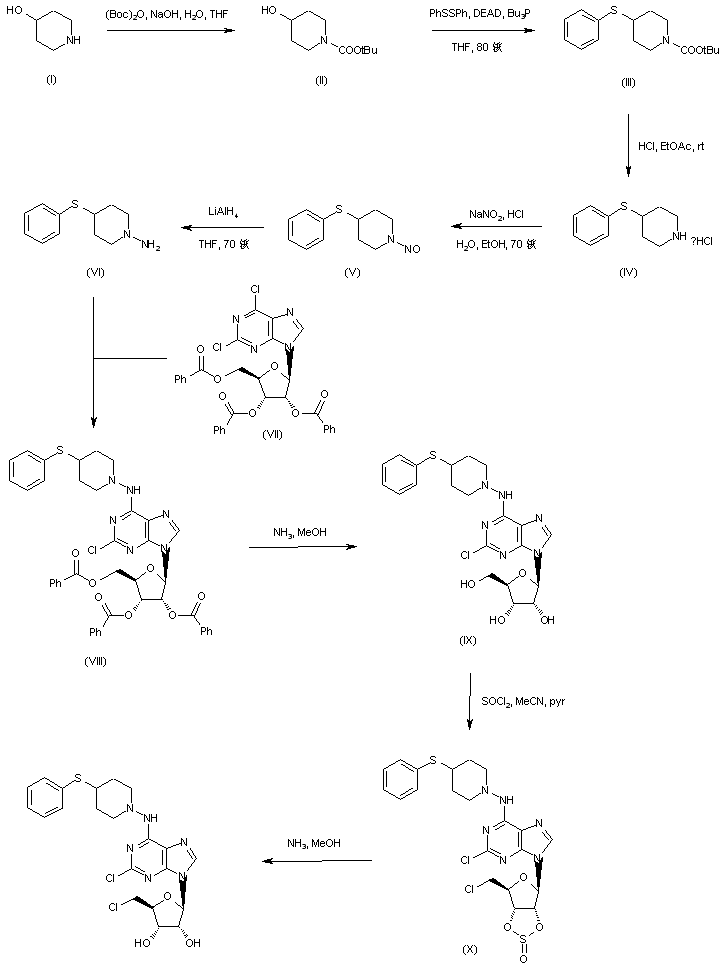 4-Hydroxypiperidine (I) was protected as the tert-butyl carbamate (II) upon treatment with (Boc)2O. Subsequent Mitsunobu coupling of (II) with diphenyl disulfide using tributylphosphine and diethyl azodicarboxylate afforded thioether (III). Acid deprotection of the Boc group of (III), followed by nitrosation of the resulting amine (IV) gave N-nitrosopiperidine (V). Further reduction of (V) with LiAlH4 yielded hydrazine (VI). Condensation of (VI) with dichloropurine derivative (VII) produced piperidinyladenosine (VIII). Debenzoylation of the tribenzoate ester (VIII) with methanolic ammonia gave (IX). Then, chlorination at position 5' with concomitant formation of the 2',3' cyclic sulfite (X) by reaction with thionyl chloride and pyridine was followed by sulfite hydrolysis with methanolic ammonia to yield the title compound.