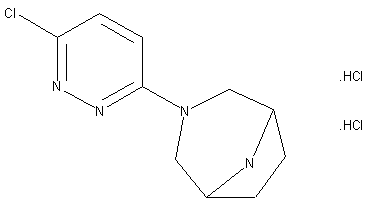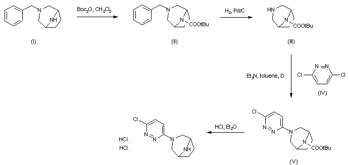 3-Benzyl-3,8-diazabicyclo[3.2.1]octane (I) was protected at the N8 position with di tert-butyl dicarbonate in CH2Cl2, and carbamate (II) was then debenzylated by catalytic hydrogenolysis over Pd/C. The resulting bicyclic amine (III) was condensed with 3,6-dichloropyridazine (IV) in the presence of Et3N to give the Boc-protected intermediate (V), which was finally deprotected with HCl in Et2O.