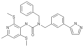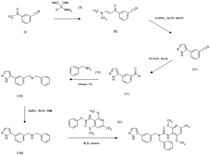 Condensation of 3-acetylbenzonitrile (I) with N,N-dimethylformamide dimethylacetal (II) at 90 C provided enaminoketone (III). Reaction of (III) with hydrazine acetate in methanol generated pyrazole (IV), and then, reduction of nitrile group with Raney Nickel in aqueous formic acid gave aldehyde (V). Condensation of this aldehyde with benzylamine (VI) in refluxing toluene, followed by reduction of the intermediate imine (VII) with ethanolic NaBH4 yielded secondary amine (VIII). Finally, the target urea was obtained by condensation of amine (VIII) with phenyl N-[2,4-bis(methylthio)-6-methylpyridin-3-yl]carbamate in the presence of triethylamine.