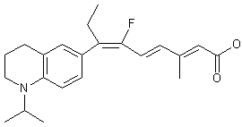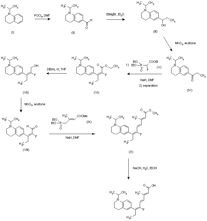 Formylation of tetrahydroquinoline (I) with N,N-dimethylformamide and POCl3 afforded aldehyde (II), which was condensed with ethylmagnesium bromide to give alcohol (III), and then oxidized to ketone (IV) with activated MnO2 in acetone. Coupling with triethyl 2-fluoro-2-phosphonoacetate (V) in the presence of NaH in DMF produced a mixture of olefins, from which the desired E isomer (VI) was separated by column chromatography. Ester reduction with DIBAL-H at -70 C provided the E-alcohol (VII), which was oxidized to aldehyde (VIII) with MnO2 in acetone. Horner-Emmons condensation with phosphonate (IX) afforded heptatrienoic ester (X), which was finally hydrolyzed with NaOH to the target heptatrienoic acid.