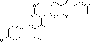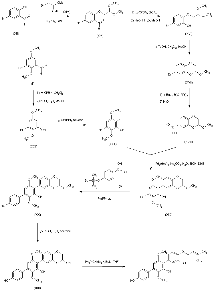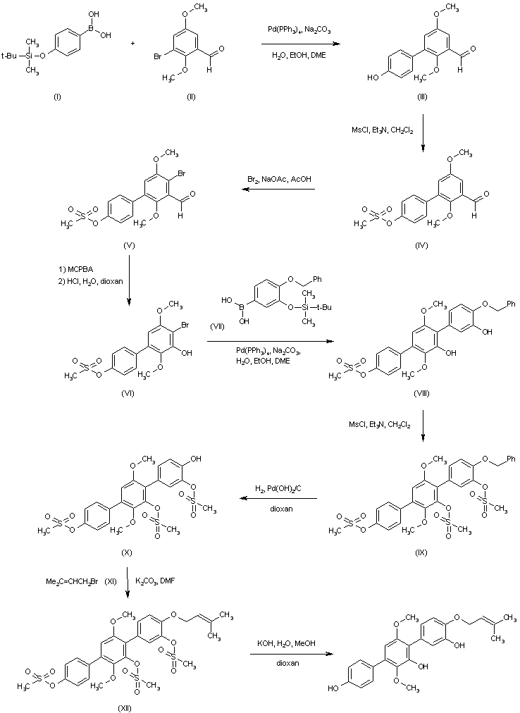 1. The Suzuki coupling of arylboronic acid (I) with 3-bromo-2,5-dimethoxybenzaldehyde (II) with concomitant desilylation provided biphenyl aldehyde (III). After protection of the phenolic hydroxyl as the mesylate (IV), selective bromination of (IV) in the presence of NaOAc in AcOH provided bromoaldehyde (V). A Baeyer-Villiger oxidation of the aldehyde group of (V) with m-chloroperbenzoic acid, followed by acid hydrolysis of the intermediate formate ester, produced phenol (VI). which was coupled with protected boronic acid (VII) in the presence of Pd(PPh3)4 to yield terphenyl (VIII). Mesylation of the hydroxyl groups of (VIII) and further hydrogenolytic cleavage of the benzyl ether gave phenol (X). Then, alkylationof (X) with prenyl bromide (XI) provided prenyl ether (XII). The mesylate groups of (XII) were finally removed by hydrolysis with KOH to furnish the title compound.