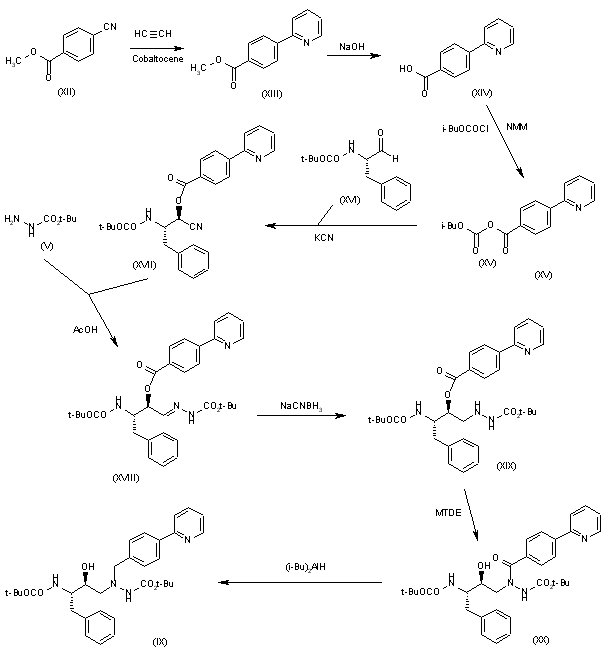 2) Intermediate (IX) can also be obtained as follows: The cyclization of 4-cyanobenzoic acid methyl ester (XII) with acetylene at 15 Atm by means of cobaltocene in toluene at 180 C gives 4-(2-pyridyl)benzoic acid methyl ester (XIII), which is saponified with NaOH in methanol to the corresponding acid (XIV). The activation of (XIV) with isobutyl chloroformate yields the mixed anhydride (XV), which is condensed with N-(tert-butoxycarbonyl)-L-phenylalaninal (XVI) and KCN in dichloromethane, affording (XVII). The reaction of (XVII) with tert-butyl carbazate (V) by means of acetic acid in methanol gives hydrazone (XVIII), which is reduced to hydrazine (XIX) by means of sodium cyanoborohydride in THF. The isomerization of (XIX) by means of 7-methyl-1,5,7-triazabicyclo[4.4.0]dec-5-ene (MTDE) in hot diglyme yields hydrazide (XX), which is finally reduced to intermediate (IX) with diisobutylaluminum hydride in dichloromethane/THF.