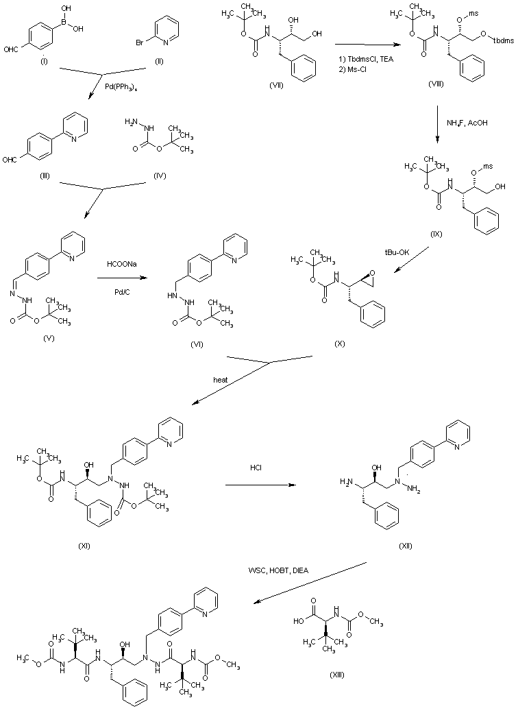 1) The reaction of 4-bromobenzaldehyde (I) with trimethylorthoformate (II) and p-toluenesulfonic acid in methanol gives ketal (III), which is condensed with 2-pyridylmagnesium bromide in THF, yielding 4-(2-pyridyl)benzaldehyde (IV). The reaction of (IV) with tert-butyl carbazate (V) in refluxing ethanol affords hydrazone (VI), which is reduced with H2 over Pd/C in methanol to the hydrazine (VII). The condensation of (VII) with the epoxide (VIII) in hot isopropanol gives the expected addition product (IX), which by treatment with HCl or formic acid results in the fully deprotected intermediate (X). Finally, this compound is condensed with N-(methoxycarbonyl)-L-tert-leucine (XI) by means of O-(2-oxo-1,2-dihydro-1-pyridyl)-N,N,N',N'-tetramethyluronium tetrafluoroborate (TPTU) in dichloromethane or DMF.