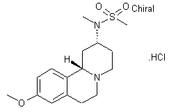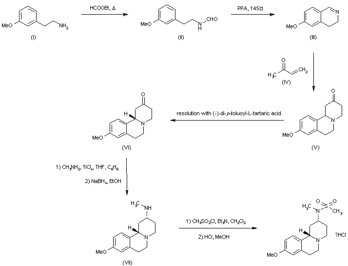 3-Methoxyphenethylamine (I) was converted into formamide (II) upon refluxing in ethyl formate. Subsequent cyclization of (II) in hot polyphosphoric acid produced the dihydroisoquinoline (III). This was subjected to a tandem Mannich-Michael condensations by refluxing in methyl vinyl ketone (IV) to yield the benzoquinolizinone system (V). The desired (S)-enantiomer (VI) was then isolated by crystallization of the diastereoisomeric salts with (-)-di-p-toluoyl-L-tartaric acid in EtOAc. Condensation of (VI) with methylamine in the presence of TiCl4, followed by reduction of the intermediate imine with NaBH4 provided amine (VII). This was finally converted to the target sulfonamide by treatment with methanesulfonyl chloride and Et3N.