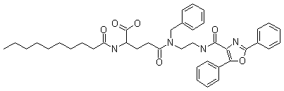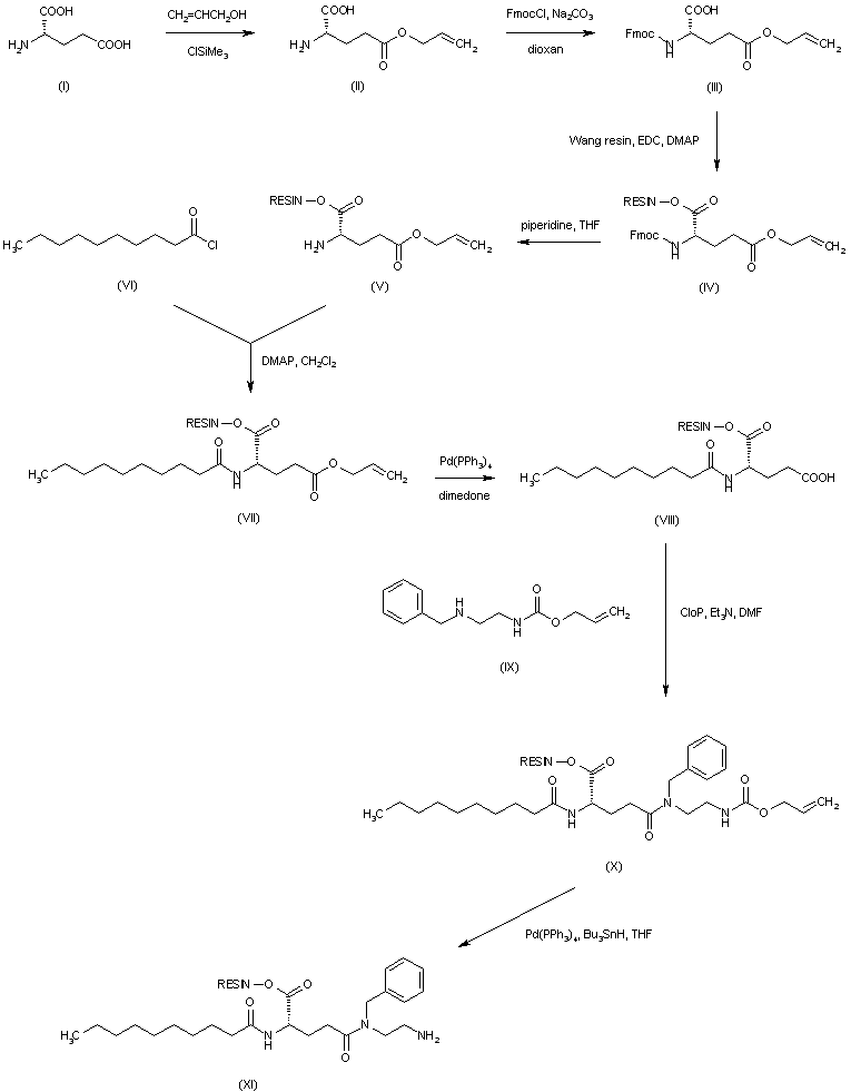 Protection of L-glutamic acid (I) with allyl alcohol and chlorotrimethylsilane produced the gamma-allyl ester (II). Subsequent treatment of (II) with fluorenylmethoxycarbonyl chloride afforded the N-Fmoc derivative (III). This was coupled to Wang resin using EDC and DMAP to provide the glutamate-coupled resin (IV). Removal of the Fmoc protecting group by means of piperidine gave (V), which was then condensed with decanoyl chloride (VI) yielding amide (VII). The allyl ester was then cleaved by treatment with Pd(PPh3)4 and the resulting carboxylic acid (VIII) was coupled with monoprotected diamine (IX) to furnish diamide (X). Deprotection of the allyl carbamate of (X) provided amine (XI).