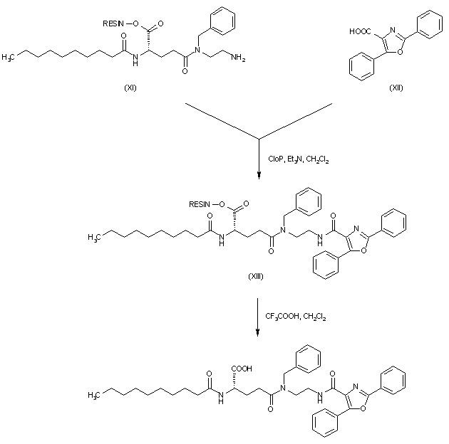 Amine (XI) was coupled to isoxazolecarboxylic acid (XII) to give (XIII). which was finally liberated from the resin by cleavage with trifluoroacetic acid in CH2Cl2.