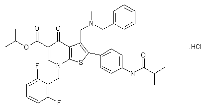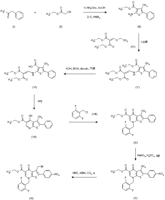 Aminothiophene (III) was prepared by condensation of phenylacetone (I) with ethyl cyanoacetate (II), followed by treatment with sulfur and diethylamine. Subsequent condensation of (III) with diethyl ethoxymethylenemalonate (IV) at 120 C provided the enaminomalonate (V). the partial hydrolysis of (V) with KOH in EtOH-dioxan provided monoacid (VI), which was cyclized by means of PPE to the thienopyridine (VII). Alkylation of (VII) with 2,6-difluorobenzyl chloride (VIII) and K2CO3 yielded predominantly the N-benzylated compound (IX), which was selectively nitrated at the phenyl ring to produce (X) (2). Radical bromination of the 3-methyl group of (X) gave bromomethyl compound (XI).