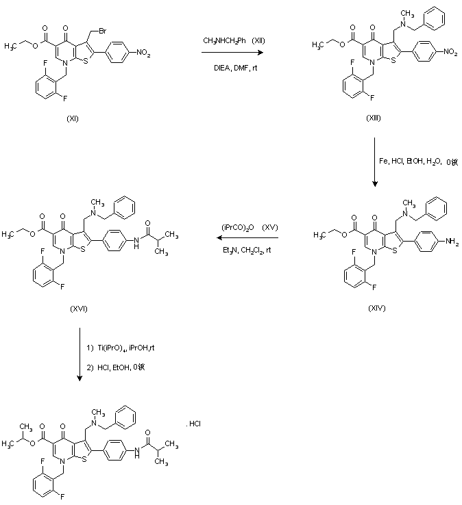 Compound (XI) was condensed with methyl benzyl amine (XII) to furnish tertiary amine (XIII). The nitro group of (XIII) was then reduced with iron powder and HCl to afford amine (XIV). Subsequent acylation of (XIV) with isobutyric anhydride (XV) in the presence of Et3N produced amide (XVI). The title compound was then obtained by transesterification between (XVI) and titanium isopropoxide in isopropanol, followed by treatment with ethanolic HCl.
