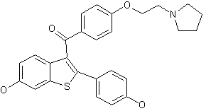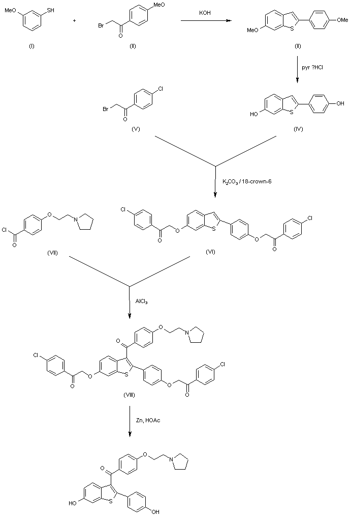 The cyclization of 3-methoxythiophenol (I) with 4-methoxyphenacyl bromide (II) by means of KOH in ethanol gives 2-(4-methoxyphenyl)-6-methoxybenzothiophene (III), which is treated with pyridinium hydrochloride at 220 C to yield 2-(4-hydroxyphenyl)-6-hydroxybenzothiophene (IV). The protection of the hydroxy groups of (IV) by reaction with 4-chlorophenacyl bromide (V) and K2CO3 - 18-crown 6 in refluxing ether affords the bis p-chlorophenacyloxy derivative (VI), which by a Friedel-Kraft's reaction with 4-(2-pyrrolidinoethoxy)benzoyl chloride (VII) by means of AlCl3 in refluxing dichloroethane is converted into 2-[4-(4-chlorophenacyloxy)phenyl]-3-[4-(2-pyrrolidinoethoxy)benzoyl]-6-(4-chlorophenacyloxy)benzothiophene (VIII). Finally, this compound is deprotected by treatment with Zn and acetic acid.
