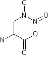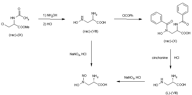 The reaction of methyl 2-acetamido-3-chloropropionate (IX) with hydroxylamine followed by hydrolysis with concentrated HCl gives D,L-2-amino-3-hydroxyaminopropionic acid (VIII), which is benzoylated with benzoyl chloride in aqueous 10% NaOH yielding D,L-2-benzoylamino-3-(N-benzoyl-N-hydroxyamino)propionic acid (X). The resolution of (X) into optical isomers by treatment with cinchonine in ethanol, followed by treatment with 20% HCl at 100 C affords L-2-amino-3-hydroxyaminopropionic acid (L)-(VIII), which is nitrosated with NaNO2 and HCl. Racemic alanosine can be obtained by nitrosation of D,L-2-amino-3-hydroxyaminopropionic acid (VIII) obtained before.