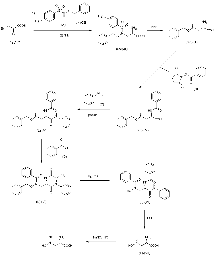 Ethyl 2,3-dibromopropionate (I) is condensed with N-tosyl-O-benzylhydroxylamine (A) by means of NaOEt in ethanol to give after a treatment with ammonia, propionic acid (II), which is detosylated by treatment with phenol and 36% HBr- yielding D,L-2-amino-3-(benzyloxyamino)propionic acid (III). The benzoylation of (III) with N-benzoyloxysuccinimide (B) by means of Triton B - in methanol affords D,L-2-benzoylamino-3-benzyloxyaminopropionic acid (IV), which is resolved into its optical isomers by treatment with aniline (C) and papain in 0.5M NaOH - 0.5M citric acid and L-cysteine hydrochloride; L-2-benzoylamino-3-benzyloxyaminopropionanilide (L)-(V) was isolated. The benzoylation of (L)-(V) with benzoyl chloride (D) in pyridine affords L-2-benzoylamino-3-(N-benzoyl-N-benzyloxyamino)propionanilide (L)-(VI), which is debenzylated by hydrogenation with H2 over Pd/C in methanol giving L-2-benzoylamino-3-(N-benzoyl-N-hydroxyamino)propionanilide (L)-(VII). The protecting groups of (L)-(VII) are eliminated by treatment with 6M HCl at 90-5 C yielding L-2-amino-3-hydroxyaminopropionic acid (L)-(VIII), which is finally nitrosated with NaNO2 and HCl.