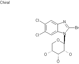 Condensation of 2-bromo-5,6-dichlorobenzimidazole (I) with 1,2,3,4-tetra-O-acetyl-beta-D-ribopyranose (II) by means of trimethylsilyl triflate and N,O-bis(trimethylsilyl)acetamide in refluxing 1,2-dichloroethane afforded the acetylated ribopyranosyl benzimidazole (III). Subsequent hydrolysis of the acetate esters using either LiOH in aqueous dioxan or Na2CO3 in H2O-EtOH yielded the title compound.