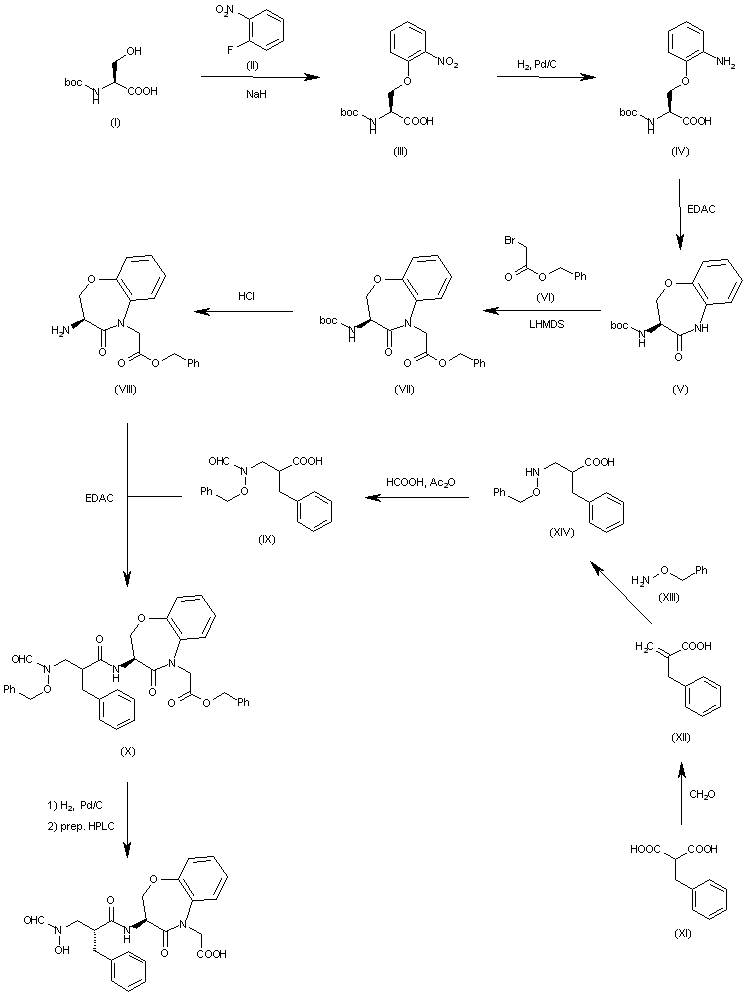The reaction of N-Boc-L-serine (I) with 2-fluoronitrobenzene (II) by means of NaH in DMF gives N-Boc-O-(2-nitrophenyl)-L-serine (III), which is reduced with H2 over Pd/C in methanol yielding the 2-aminophenyl derivative (IV). The cyclization of (IV) by means of EDAC in DMF affords the benzoxazepinone (V), which is condensed with benzyl 2-bromoacetate (VI) by means of LHMDS in THF providing the benzoxazepinone acetic ester (VII). The deprotection of the carbamate group of (VII) with HCl in dioxane affords (VIII) with a free amino group that is condensed with 2-benzyl-3-[N-(benzyloxy)-N-formylamino]propionic acid (IX) by means of EDAC in dichloromethane giving the corresponding amide (X). The deprotection of the benzyl groups of (X) with H2 over Pd/C in methanol yields the expected mixture of diastereomers that is resolved by preparative HPLC to afford the target compound. The intermediate 2-benzyl-3-[N-(benzyloxy)-N-formylamino]propionic acid (IX) has been obtained as follows: The reaction of benzylmalonic acid (XI) with aqueous formaldehyde and dimethylamine gives 2-benzyl-2-propenoic acid (XII), which is condensed with O-benzylhydroxylamine (XIII) in refluxing ethanol yielding 2-benzyl-3-(benzyloxyamino)propionic acid (XIV). Finally, this compound is N-formylated with formic acid/acetic anhydride to afford the desired intermediate (IX).