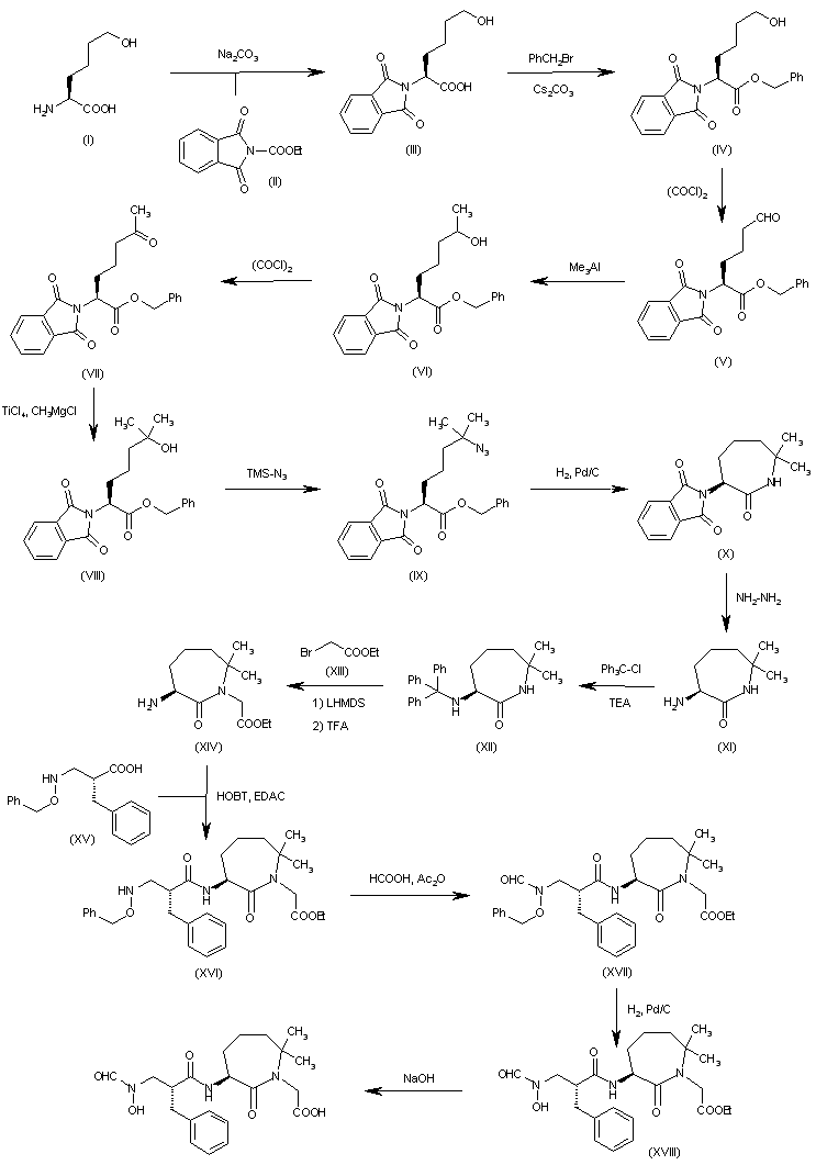 The reaction of (S)-2-amino-6-hydroxyhexanoic acid (I) with N-(ethoxycarbonyl)phthalimide (II) by means of Na2CO3 in water gives 6-hydroxy-2(S)-(phthalimido)hexanoic acid (III), which is esterified with benzyl bromide and Cs2CO3 in DMF yielding the benzyl ester (IV). The oxidation of the terminal OH group of (IV) with (COCl)2 in dichloromethane affords the aldehyde (V), which is methylated with AlMe3 in dichloromethane giving 6-hydroxy-2(S)-(phthalimido)heptanoic acid (VI). The oxidation of (VI) with oxalyl chloride as before yields the ketone (VII), which is methylated with TiCl4 and methylmagnesium chloride to provide the carbinol (VIII). The reaction of (VIII) with trimethylsilyl azide in dichloromethane gives the azido derivative (IX), which is cyclized by reduction with H2 over Pd/C in DMF yielding the perhydroazepinone (X). Elimination of phthalimido protecting group of (X) with hydrazine in methanol/dichloromethane affords 3(S)-amino-7,7-dimethylperhydroazepin-2-one (XI), which is protected with trityl chloride and TEA in dichloromethane to give the tritylamino compound (XII). The condensation of (XII) with ethyl 2-bromoacetate (XIII) by means of LHMDS, followed by deprotection with TFA affords the adduct (XIV) with a free amino group, which is acylated with 2(R)-benzyl-3-(benzyloxyamino)propionic acid (XV) by means of HOBT and EDAD in dichloromethane providing the amide (XVI). The formylation of (XVI) with formic acid and acetic anhydride gives the formamide (XVII), which is deprotected with H2 over Pd/C in ethanol yielding intermediate (XVIII). Finally, this compound is hydrolyzed with NaOH in methanol.