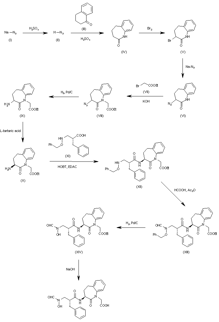 Sodium azide (I) is treated with sulfuric acid to give hydrazoic acid (II), which is condensed with 1-tetralone (III) in hot aqueous sulfuric acid yielding 2,3,4,5-tetrahydro-1H-1-benzazepin-2-one (IV). The bromination of (IV) with Br2 in chloroform affords the 3-bromo derivative (V), which is treated with sodium azide in DMSO to give the corresponding azido derivative (VI). The condensation of (VI) with ethyl 2-bromoacetate (VII) by means of KOH and tetrabutylammonium bromide in THF yields the adduct (VIII). The azido group of (VIII) is reduced with H2 over Pd/C in ethanol the amine (IX) as a racemic mixture, which is submitted to optical resolution with L-tartaric acid affording the desired (S)-enantiomer (X). The condensation of intermediate (X) with 2(R)-benzyl-3-benzyloxyamino)propionic acid (XI) by means of HOBT and EDAC in dichloromethane provides the amide (XII), which is formylated with formic acid and acetic anhydride yielding the formamide (XIII). The debenzylation of (XIII) with H2 over Pd/C in methanol affords the intermediate (XIV), which is finally hydrolyzed with NaOH in methanol.