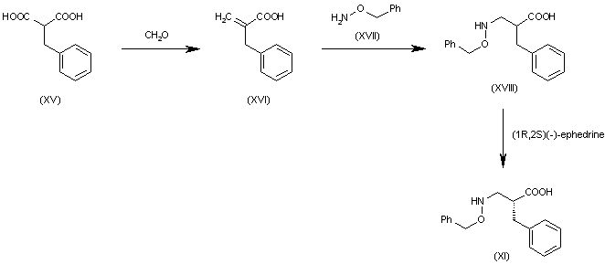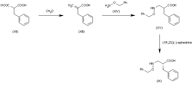 The intermediate 2(R)-benzyl-3-(benzyloxyamino)propionic acid (XV) has been obtained as follows: The reaction of benzylmalonic acid (XIX) with aqueous formaldehyde and dimethylamine gives 2-benzyl-2-propenoic acid (XX), which is condensed with O-benzylhydroxylamine (XXI) in refluxing ethanol yielding racemic 2-benzyl-3-(benzyloxyamino)propionic acid (XXII). Finally, this compound is submitted to optical resolution with (1R,2S)(-)-ephedrine in acetonitrile to afford the chiral target intermediate (XV).