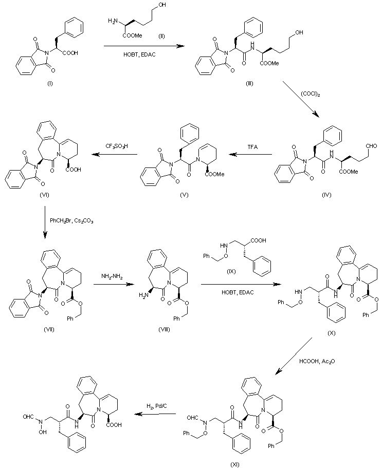 The condensation of N-phthaloyl-L-phenylalanine (I) with 2(S)-amino-6-hydroxyhexanoic acid methyl ester (II) by means of HOBT and EDAC in DMF/dichloromethane gives the dipeptide (III), which is oxidized at the terminal OH with (COCl)2 in dichloromethane yielding the aldehyde (IV). The cyclization of (IV) with TFA in dichloromethane affords the tetrahydropyridine (V), which is cyclized again by means of trifluoromethanesulfonic acid in dichloromethane to provide the tricyclic carboxylic acid (VI). The esterification of (VI) with PhCH2Br and Cs2CO3 in DMF gives the benzyl ester (VII), which is treated with hydrazine to eliminate the phthalimido group and yielding intermediate (VIII). The reaction of the free amino group of (VIII) with 2(R)-benzyl-3-(benzyloxyamino)propionic acid (IX) by means of HOBT and EDAC in dichloromethane affords the amide (X), which is formylated with formic acid and acetic anhydride to provide the formamide (XI). Finally, this compound is debenzylated with H2 over Pd/C in methanol to furnish the target compound.
