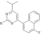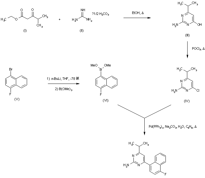 Cyclization of ethyl 4-methyl-3-oxopentanoate (I) with guanidine carbonate (II) in boiling EtOH gave 2-amino-4-hydroxy-6-isopropylpyrimidine (III), which was converted to the corresponding chloropyrimidine (IV) by means of POCl3. Boronic ester (VI) was prepared by lithiation of 1-bromo-4-fluoronaphthalene (V) with n-butyllithium, followed by reaction with trimethyl borate. Subsequent coupling of chloropyrimidine (IV) with boronic ester (VI) in the presence of tetrakis(triphenylphosphine)palladium yielded the target naphthylpyrimidine.