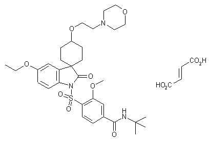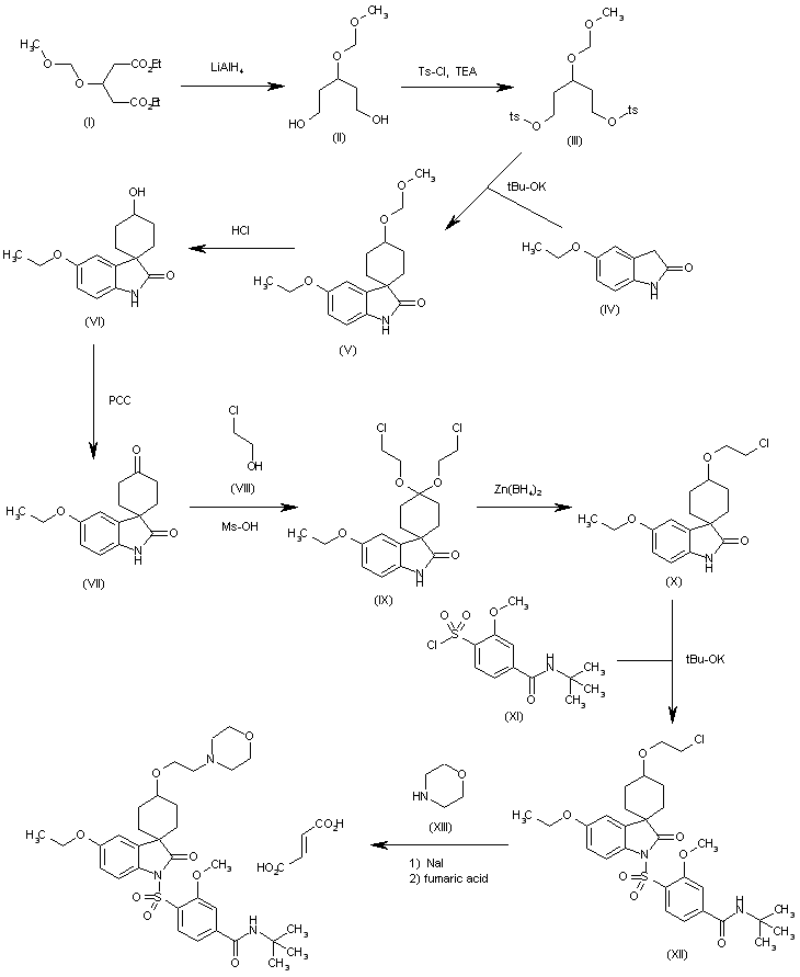 The reduction of diethyl 3-(methoxymethoxy)glutarate (I) with LiAlH4 in THF gives 3-(methoxymethoxy)pentane-1,5-diol (II), which is treated with Ts-OH and TEA in THF to yield the disulfonate (III). The condensation of (III) with 5-ethoxyindolin-2-one (IV) by means of tBu-OK in THF affords the spiro compound (V), which is deprotected with HCl in methanol to afford the spiranic alcohol (VI). The oxidation of (VI) with pyridinium chlorochromate (PCC) over Al2O3 provides the spiranic cyclohexanone (VII), which is treated with 2-chloroethanol (VIII) and Ms-OH in toluene to give the ketal (IX). The reaction of (IX) with zinc borohydride and trimethylsilyl chloride in ethyl ether/dichloromethane yields the 2-chloroethoxy derivative (X), which is condensed with 4-(N-tert-butylcarbamoyl)-2-methoxybenzenesulfonyl chloride (XI) by means of tBu-OK in THF to afford the adduct (XII). Finally, the target compound is obtained by condensation of (XII) with morpholine (XIII) by means of NaI in DMF, followed by treatment with fumaric acid.