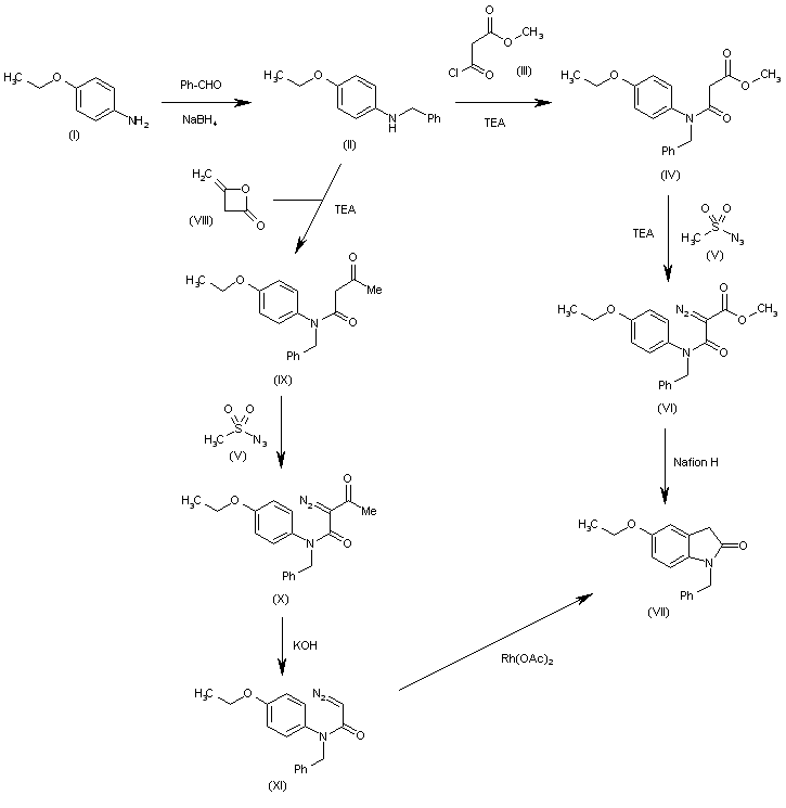 Indolinone intermediate (VII): 1. The reductoalkylation of 4-ethoxyaniline (I) with benzaldehyde and NaBH4 in methanol gives the protected aniline (II), which is condensed with methoxymalonyl chloride (III) by means of TEA in dichloromethane to yield the malonamic derivative (IV). The reaction of (IV) with methanesulfonyl azide (V) and TEA affords the diazo compound (VI), which is finally submitted to a decarboxylative cyclization by means of Nafion H (a perfluorinated ion exchange resin) to provide the target indolinone intermediate (VII). 2. The condensation of the protected aniline (II) with diketene (VIII) by means of TEA in THF gives the 3-oxobutyramide (IX), which is treated with methanesulfonyl azide (V) and TEA to yield the diazo compound (X). The deacylation of (X) with KOH in acetonitrile affords the diazoacetamide (XI), which is finally cyclized to the target indolinone intermediate (VII) by means of Rh(OAc)2 in dichloromethane.