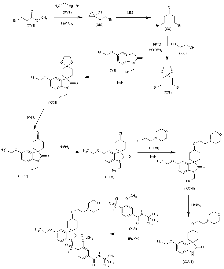 Assembly of the target compound: The reaction of methyl 3-bromopropionate (XVII) with ethylmagnesium bromide (XVIII) and Ti(iPrO)4 gives 1-(2-bromoethyl)cyclopropan-1-ol (XIX), which is brominated by NBS in CCl4 to yield 1,5-dibromo-3-pentanone (XX). The reaction of (XX) with ethylene glycol (XXI), HC(OEt)3 and PPTS affords the cyclic ketal (XXII), which is cyclized with the indolinone intermediate (VII) by means of NaH in DMF to provide the spiro compound (XXIII). The deprotection of (XXIII) with PPTS in acetone/water gives the spiranic diketone (XXIV), which is selectively reduced with NaBH4 in methanol to yield the spiro cyclohexanol (XXV). The condensation of (XXV) with 4-(2-chloroethyl)morpholine (XXVI) by means of NaH in hot toluene affords the corresponding ether (XXVII), which is debenzylated by means of Li/NH3 to provide intermediate (XXVIII) with a free NH group. Finally, the sulfonation of (XXVIII) with intermediate chlorosulfonyl benzamide (XVI) by means of potassium tert-butoxide gives the target sulfonyl benzamide compound.