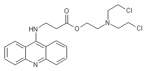 Activation of N-Boc-beta-alanine (I) as the mixed anhydride (II) with isobutyl chloroformate, followed by condensation with triethanolamine (III), furnished the [bis(2-hydroxyethyl)amino]ethyl ester (IV). Silylation of the free hydroxyl groups of (IV) by means of tert-butyldimethylsilyl chloride and imidazole afforded the bis-silylether (V). The N-Boc protecting group of (V) was then selectively removed upon treatment with trifluoroacetic acid to give amino ester (VI). This was subsequently coupled with 9-methoxyacridine (VII), yielding adduct (VIII), which was further desilylated with HF/pyridine. The resultant bis(hydroxyethyl) derivative (IX) was finally converted to the target dichloro compound by treatment with thionyl chloride.