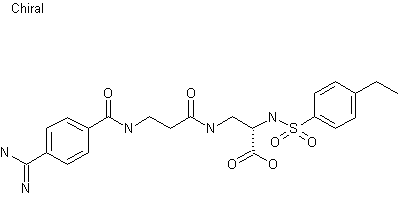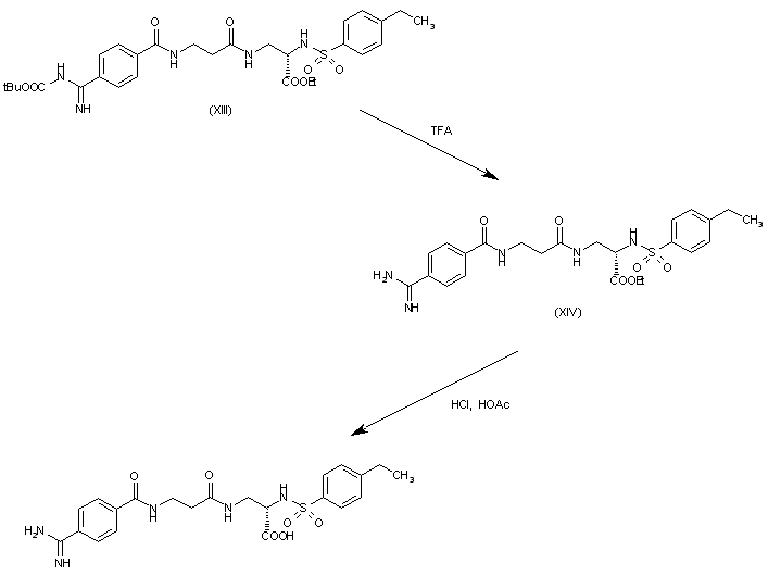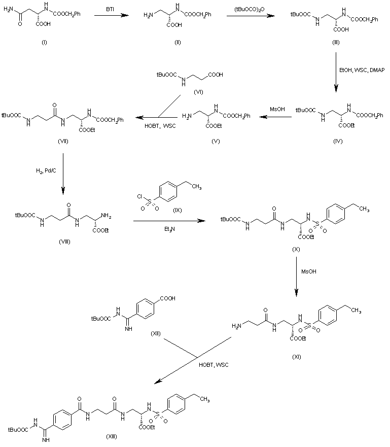 The reaction of N-(benzyloxycarbonyl)-L-asparagine (I) with bis(trifluoroacetyl)iodobenzene (BTI) in DMF/water gives 3-amino-2(S)-(benzyloxycarbonylamino)propionic acid (II), wehich is protected at the amino group with tert-butoxycarbonyl anhydride yielding carbamate (III). The esterification of (III) with ethanol WSC and DMAP affords the expected ethyl ester (IV), which is selectively deprotected with methanesulfonic acid in acetonitrile providing 3-amino-2-(benzyloxycarbonylamino)propionic acid ethyl ester (V). The condensation of (V) with N-(tert-butoxycarbonyl)-beta-alanine (VI) by means of HOBT, WSC and triethylamine in DMF gives the protected propionamidopropionic ester (VII), which is selectively deprotected by hydrogenation with H2 over Pd/C in ethanol/ethyl acetate giving the 2-aminopropionic ester (VIII). The condensation of (VIII) with 4-ethylbenzenesulfonyl chloride (IX) by means of triethylamine in dichloromethane yields the sulfonamide (X), which is deprotected with methanesulfonic acid as before afording intermediate (XI) with a free amino group, which is condensed with 4-(tert-butoxycarbonylamino)benzoic acid (XII) by means of HOBT and WSC in DMF providing the fully protected target compound (XIII).