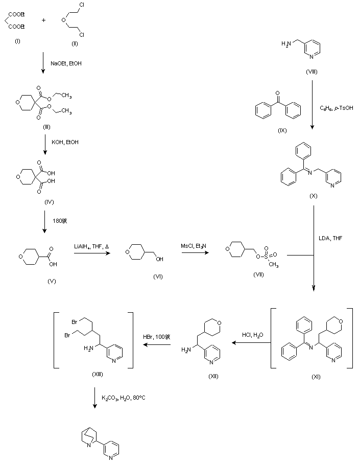 | 合成路线图解说明: Alkylation of diethyl malonate (I) with chloroethyl ether (II) in the presence of NaOEt in refluxing EtOH provided tetrahydropyran dicarboxylate (III). Hydrolysis of diester (III) with ethanolic KOH, and decarboxylation of the resulting diacid (IV) at 180 C gave tetrahydropyran-4-carboxylic acid (V). This was reduced to the alcohol (VI) on treatment with LiAlH4 in refluxing THF, and then converted into mesylate (VII) by reaction with metanesulfonyl chloride and triethylamine in THF. 3-(Aminomethyl)pyridine (VIII) was protected as the imine (X) by reaction with benzophenone (IX) in refluxing benzene with a Dean-Stark trap. Alkylation of imine (X) with mesylate (VII) in the presence of LDA in cold THF gave intermediate (XI) which, on acidic hydrolysis provided amine (XII). Reaction of (XII) with saturated aqueous HBr at 100 C in a pressure tube formed dibromide (XIII), which was basified with K2CO3 and heated to 80 C to provide the target quinuclidine. |