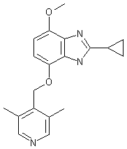 Condensation of methyl 3-amino-4-methoxybenzoate (I) with cyclopropyl cyanide (II) in the presence of p-toluenesulfonic acid at 180 C gave amidine (III). Subsequent reaction of (III) with sodium hypochlorite in methanolic HCl, followed by treatment of the intermediate chloroimine with aqueous Na2CO3, furnished the benzimidazole (IV). The ester group of (IV) was reduced to alcohol (V) with DIBAL-H, and then oxidized to aldehyde (VI) using activated MnO2. Protection of the imidazole N-H of (VI) was effected by means of 2-(trimethylsilyl)ethoxymethyl chloride (VII) and NaH to afford the 1-(2-trimethylsilyl)ethoxymethylimidazole (VIII) accompanied by some amounts of the 3-substituted analogue. The Baeyer-Villiger rearrangement of the formyl group employing m-chloroperbenzoic acid then produced phenol (IX), together with the 3-protected imidazole. The pyridylmethanol derivative (XIII) was obtained from 4-nitro-3,5-dimethylpyridine N-oxide (X) through conversion to the bromopyridine (XI) with PBr3, followed by lithium-halogen exchange and condensation with DMF to give aldehyde (XII), and then reduction of (XII) with NaBH4 to (XIII). Condensation of the hydroxybenzimidazole (IX) with pyridylmethanol (XIII) using diisopropylazodicarboxylate and triphenylphosphine gave ether (XIV), which was finally deprotected with HCl in boiling aqueous methanol to yield the target compound.