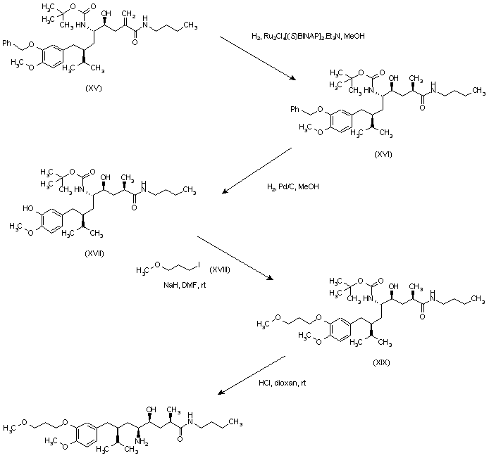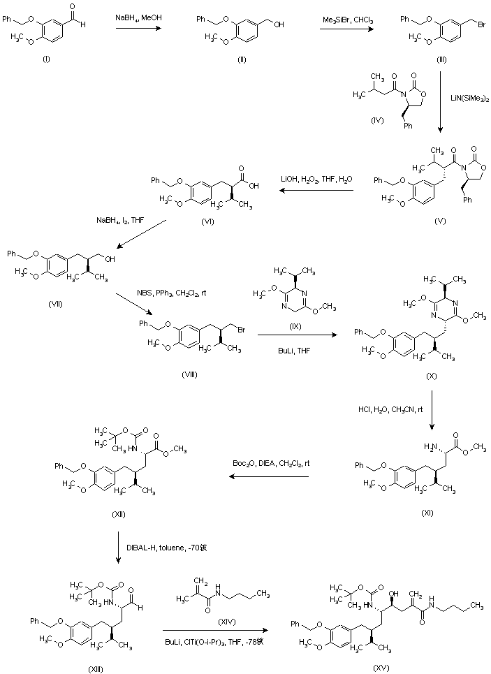 3-Benzyloxy-4-methoxybenzaldehyde (I) was reduced to benzyl alcohol (II) with NaBH4, and then converted into bromide (III) using Me3SiBr. Alkylation of 4-(R)-benzyl-3-isovaleroyl-oxazolidinone (IV) with bromide (III) in the presence of lithium hexamethyldisilazide in THF at -70 C produced the (R,R) diastereoisomer (V). Then, hydrolysis of (V) with lithium hydroperoxide gave the (R)-acid (VI), which was reduced to alcohol (VII) by means of NaBH4 and I2. The reation of (VII) with NBS and PPh3 yielded bromide (VIII), which was condensed with dihydropyrazine (IX) in the presence of BuLi to give compound (X) as the major diastereoisomer. Subsequent acid hydrolysis of the dihydropyrazine (X) provided aminoester (XI), which was protected as the tert-butyl carbamate (XII) with Boc2O and DIEA. The carboxylate group of (XII) was reduced to aldehyde (XIII) with DIBAL-H in cold toluene. This aldehyde (XIII) was condensed with N-butyl methacrylamide (XIV) in the presence of butyllithium and chlorotitanium triisopropoxide at -75 C to give a mixture of diastereoisomeric aminoalcohols, from which the major threo compound (XV) was isolated by column chromatography.