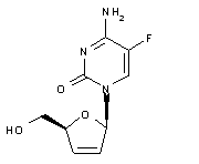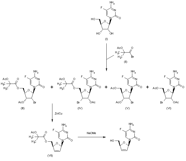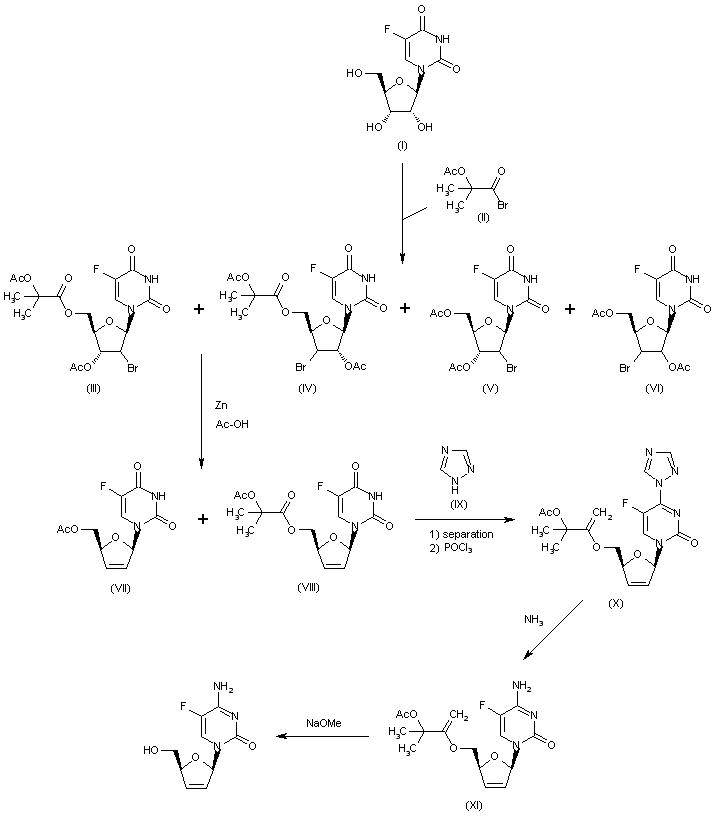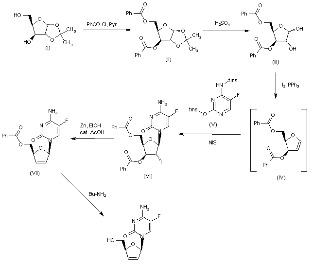 The acylation of 2,3-O-isopropylidene-alpha-D-xylofuranose (I) with benzoyl chloride and pyridine gives the dibenzoyl ester (II), which is deprotected by means of H2SO4/HOAc in hot THF to yield 3,5-di-O-benzoyl-alpha-D-xylofuranose (III). The reaction of (III) with PPh3, I2 and imidazole in dichloromethane affords the glycal (IV), which is used in the glycosylation of the N,O-disilylated 5-fluorocytosine (V) by means of NIS in dichloromethane to provide the 2'-alpha-iodonucleoside (VI). The treatment of (VI) with Zn in EtOH/ethyl acetate (HOAc is used as catalyst) gives the unsaturated nucleoside (VII), which is finally debenzoylated by means of butylamine in THF.