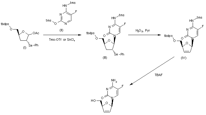 The condensation of the known acetate (I) with N,O-disylilated cytosine (II) by means of Tms-OTf or SnCl4 gives the selenium containing nucleoside (III), which is submitted to an oxidative elimination reaction by means of H2O2 and pyridine in dichloromethane to yield the unsaturated nucleoside (IV). Finally, this compound is desilylated by means of TBAF in THF.