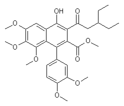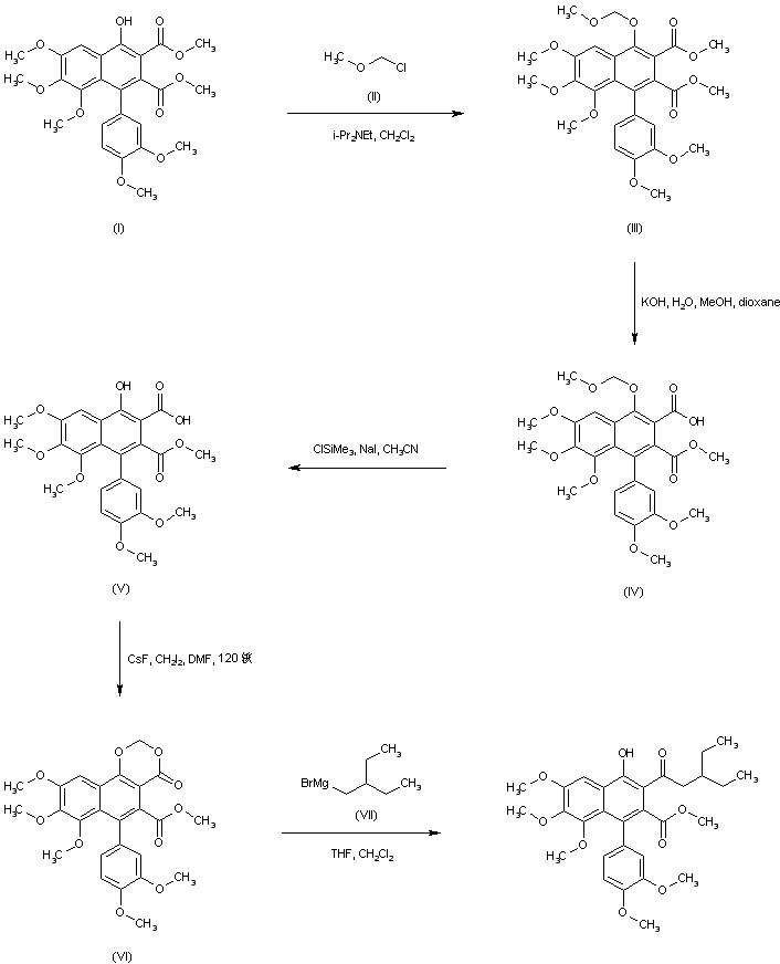 In an alternative procedure, the known hydroxynaphthalene dicarboxylate (I) is protected as the methoxymethyl ether (III) using chloromethyl methyl ether (II) and diisopropyl ethylamine. Subsequent partial hydrolysis of diester (III) with KOH leads to acid (IV). Removal of the methoxymethyl protecting group of (IV) to produce naphthol (V) is accomplished by treatment with in situ generated iodotrimethylsilane. Hydroxy acid (V) is then converted to the dioxinone derivative (VI) employing diiodomethane and CsF in hot DMF. Finally, addition of the Grignard reagent (VII) to the lactone function of (VI) yields the desired 2-ethylbutyl ketone.
