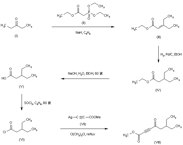 The Wadsworth-Emmons condensation of 3-pentanone (I) with phosphonate (II) affords the conjugated ester adduct (III). Subsequent double bond hydrogenation in (III), in the presence of Pd/C, leads to the saturated ester (IV). After basic hydrolysis of the ethyl ester group of (IV), the resultant carboxylic acid (V) is activated as the corresponding acid chloride (VI) upon treatment with SOCl2. Then, acylation of the silver acetylide of methyl propiolate (VII) with acid chloride (VI) gives rise to the oxo ester intermediate (VIII).