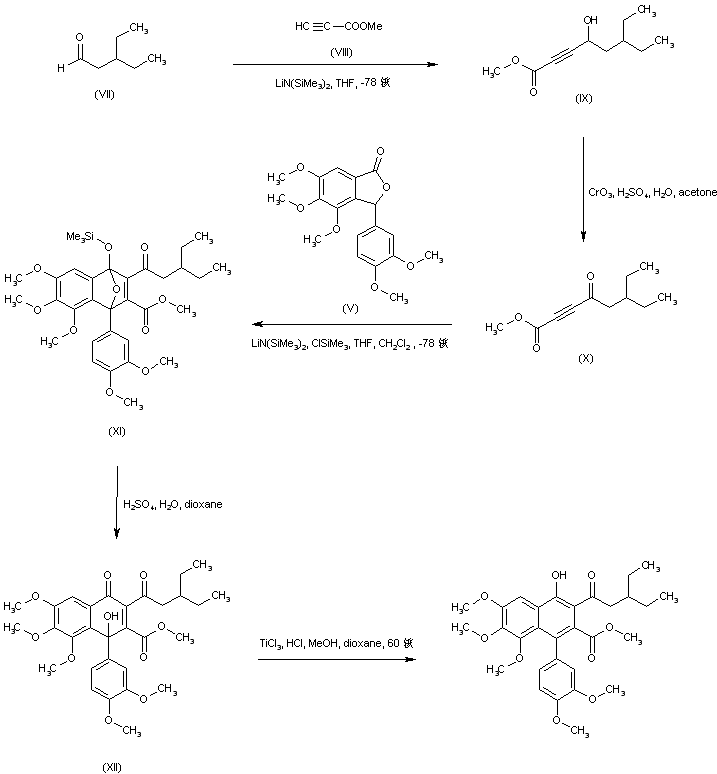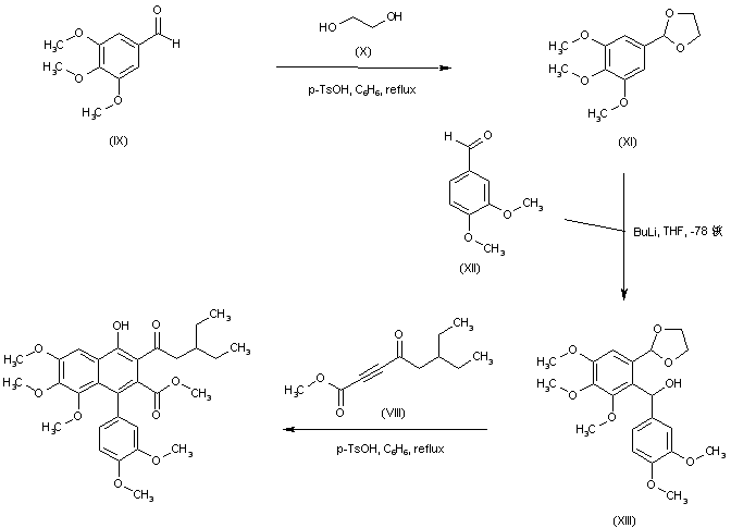 Protection of 3,4,5-trimethoxybenzaldehyde (IX) with ethylene glycol (X) affords acetal (XI). After lithiation of (XI) by means of butyllithium, addition to veratraldehyde (XII) furnishes carbinol (XIII). Finally, cyclization of hydroxy acetal (XIII) with alkyne (VIII) under acidic conditions provides the title naphthol derivative.