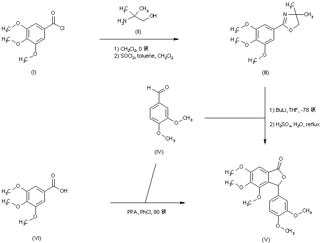 A different synthetic strategy requires the precursor phthalide derivative (V), which is prepared by two related ways. 3,4,5-Trimethoxybenzoyl chloride (I) is condensed with 2-amino-2-methyl-1-propanol (II), and the resultant hydroxy amide is further cyclized with SOCl2 to the oxazoline (III). Lithiation of (III), followed by addition to veratraldehyde (IV) and acidic oxazoline hydrolysis, leads to the target lactone (V). Alternatively, isobenzofuranone (V) is obtained by direct condensation between trimethoxybenzoic acid (VI) and veratraldehyde (IV) in the presence of polyphosphoric acid.