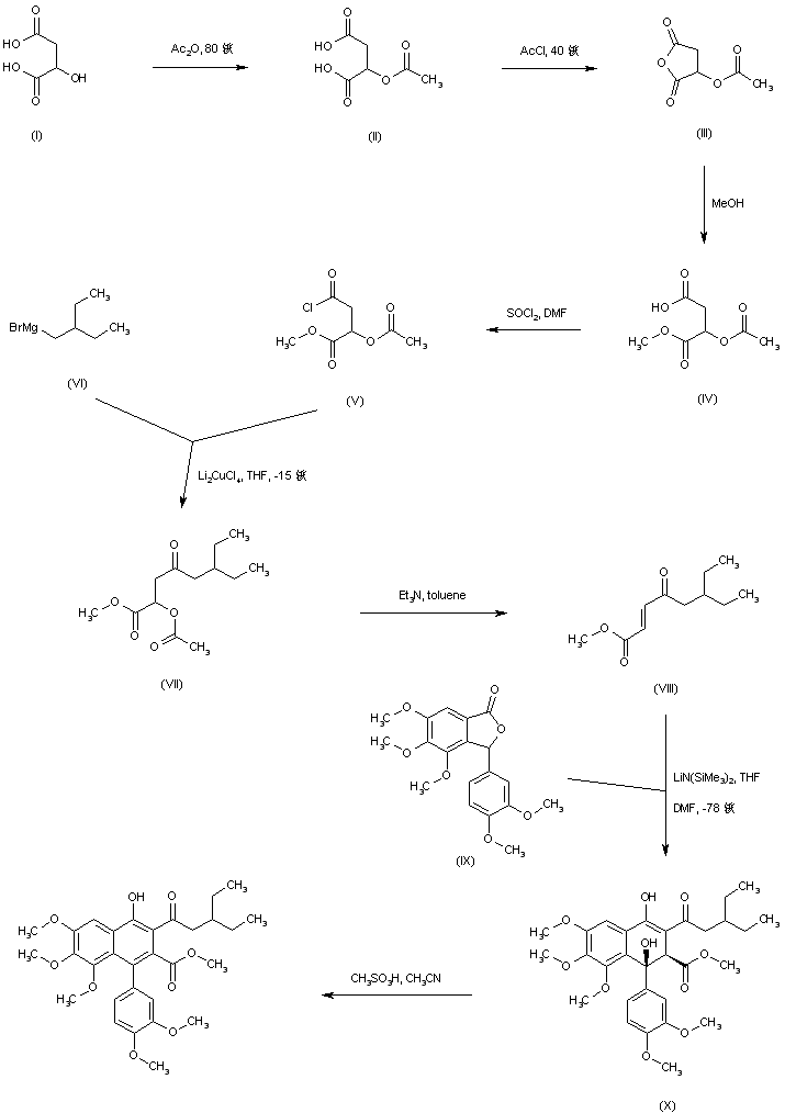 In a related procedure, malic acid (I) is converted into the O-acetylated monomethyl ester (IV) by a sequence involving O-acetylation with acetic anhydride, followed by dehydration of the resultant O-acetyl malic acid (II) to the cyclic anhydride (III), which undergoes further methanolysis to mono ester (IV). Mono-acid (IV) is then chlorinated with SOCl2, yielding acid chloride (V). Subsequent Li2CuCl4-catalyzed cross-coupling of acid chloride (V) with 2-ethylbutylmagnesium bromide (VI) affords ketone (VII). Elimination of the acetate group of (VII) with triethylamine in toluene leads to the acyl propenoate (VIII). This is subjected to cycloaddition reaction with the lithium derivative of phthalide (IX) producing the dihydroxydihydronaphthalene adduct (X). Finally, dehydration of (X) under acidic conditions furnishes the title compound.
