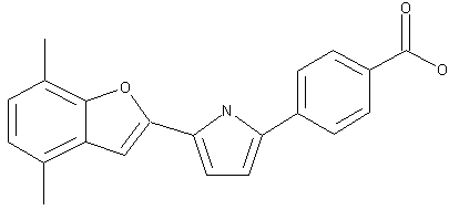 The condensation of 7-ethyl-4-methylbenzofuran-2-carbaldehyde (I) with 4-acryloylbenzoic acid methyl ester (II) by means of 3-benzyl-5-(hydroxymethyl)-4-methylthiazolium chloride (BHMT) in hot DMF gives the 1,4-butanedione (III), which is cyclized with ammonium acetate in refluxing methanol to yield the substituted pyrrole (IV). Finally, the ester group of (IV) is hydrolyzed with NaOH in refluxing ethanol/water.