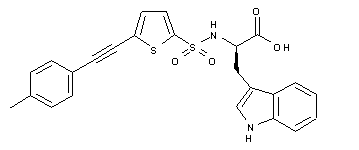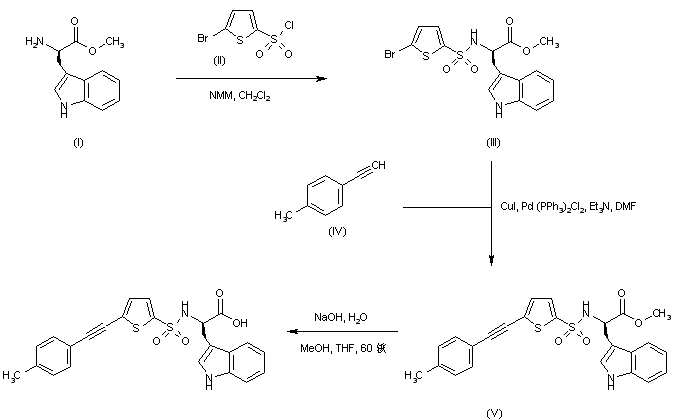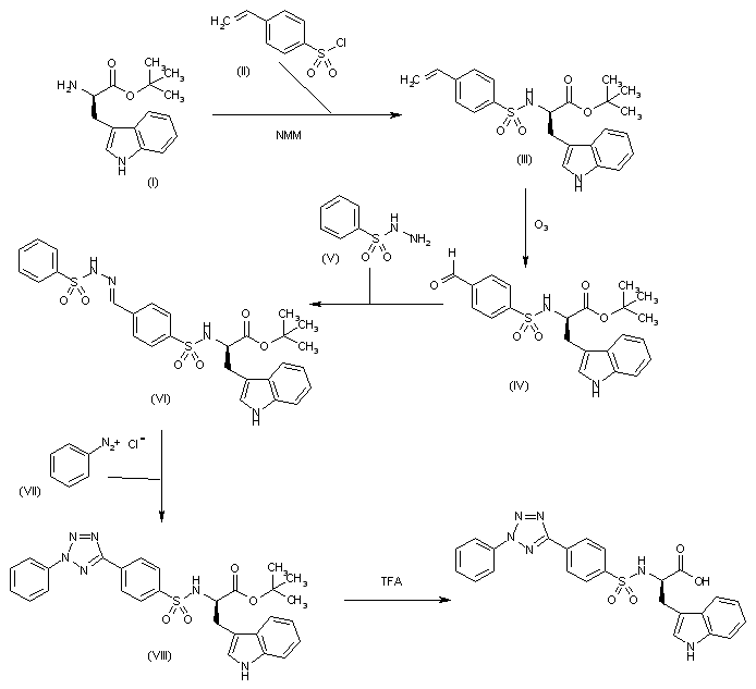 | 合成路线图解说明: The sulfonation of D-tryptophan tert-butyl ester (I) with 4-vinylphenylsulfonyl chloride (II) and NMM in dichloromethane gives N2-(4-vinylphenylsulfonyl)-D-tryptophan tert-butyl ester (III), which is treated with ozone in dichloromethane to yield the benzaldehyde (IV). The condensation of (IV) with phenylsulfonyl hydrazide (V) in ethanol/THF affords the phenylsulfonyl hydrazone (VI), which is cyclized with phenyldiazonium chloride (VII) (aniline, NaNO2 and aq. HCl) in pyridine to provide the tetrazole derivative (VIII). Finally, the tert-butyl ester group of (VIII) is hydrolyzed with THF in dichloromethane to furnish the target D-tryptophan derivative. |
