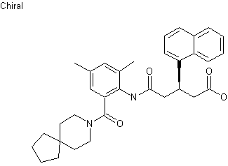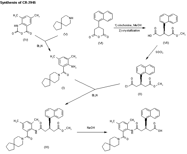The condensation of the amine (I) with the chloride of 3(R)-(1-naphthyl)glutaric acid monomethyl ester (II) by means of triethylamine in hot toluene gives the glutaramic ester (III), which is finally hydrolyzed with NaOH in methanol/methylene chloride/water. The intermediates (I) and (II) have been obtained as follows: 1) Intermediate (I) is obtained by condensation of 3,5-dimethylisatoic acid anhydride (IV) with 8-azabicyclo[4.5]decane (V) by means of triethylamine in refluxing toluene. 2) Intermediate (II) is obtained by reaction of 3-(1-naphthyl)glutaric anhydride (VI) with methanol, yielding the racemic monomethyl ester, which without isolation is submitted to optical resolution with cinchonine, thus obtaining the 3(R)-monoester (VII). Finally, this compound is treated with SOCl2 in refluxing ethyl ether.