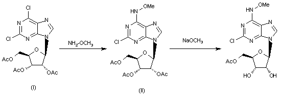 The reaction of 2,6-dichloro-9-(2',3',5'-tri-O-acetyl-beta-D-ribofuranosyl)-9H-purine (I) with O-methylhydroxylamine in hot dioxane gives 2',3',5'-tri-O-acetyl-2-chloro-N-methoxy-adenosine (II), which is then treated with sodium methoxide in methanol.