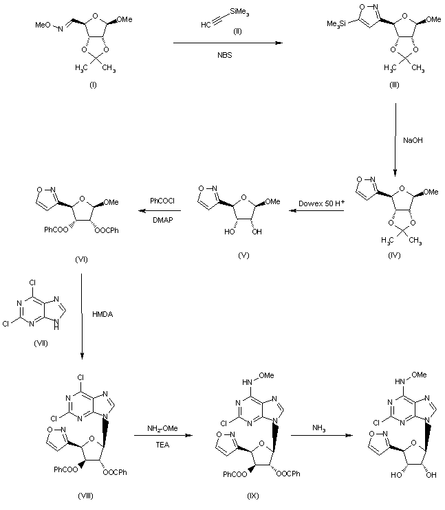 The cyclization of ribofuranoside (I) with trimethylsilyl acetylene (II) by means of NBS in DMF gives the trimethylsilylisoxazole (III), which is desilylated with NaOH in methanol yielding the isoxazole (IV). Elimination of the isopropylidene protecting group of (IV) by passing through a Dowex 50 H+ column affords the dihydroxy compound (V), which is benzoylated with benzoyl chloridde and DMAP in pyridine giving the dibenzoyl derivative (VI). The condensation of (VI) with 2,6-dichloro-9H-purine (VII) in refluxing hexamethyldisilazane (HMDA) provides the purine derivative (VIII), which is treated with 0-methylhydroxylamine and triethylamine in refluxing dioxane yielding the adenosine derivative (IX). Finally, this compound is debenzoylated with ammonia in methanol.