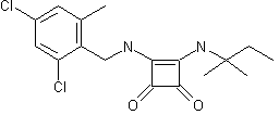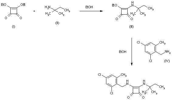 A general synthetic route to a series of novel N-aryl and N-benzyl diaminocyclobutenedione derivatives and pertinent SAR data have been reported elsewhere. KCO-616 can be conveniently synthesized in two steps as shown in Scheme 26121401a. An ethanolic solution of 3,4-diethoxy-3-cyclobutene-1,2-dione (I) is allowed to react with tert-amylamine (II) at room temperature for a period of 24 h to give intermediate 3-(1,1-dimethylpropylamino)-4-ethoxy-3-cyclobutene-1,2-dione (III) in 90% isolated, purified yield. The condensation of this compound with 2,4-dichloro-6-methylbenzylamine (IV, recrystallized from boiling diethyl ether) in ethanol at room temperature for 24 h affords analytically pure 3-(2,4-dichloro-6-methylbenzylamino)-4-(1,1-dimethylpropylamino)-3-cyclobutene-1,2-dione (KCO-616) in 92% yield.