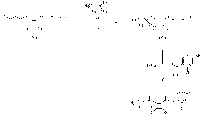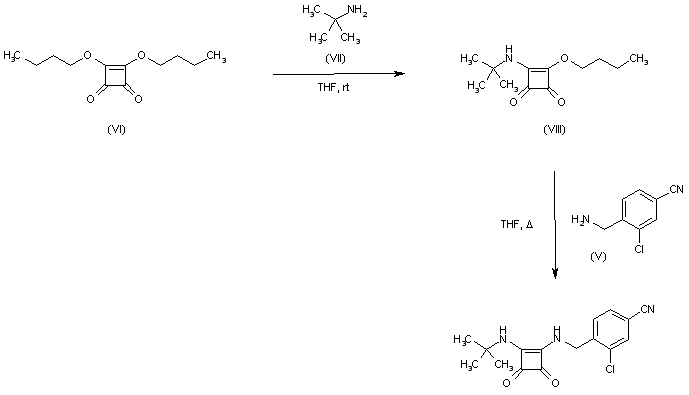 Treatment of 3,4-dibutoxy-3-cyclobutene-1,2-dione (VI) with tert-butylamine (VII) yielded the amino cyclobutenedione (VIII). Subsequent condensation of (VIII) with 3-chloro-4-(aminomethyl)benzonitrile (V) in THF provided the target diamino derivative.